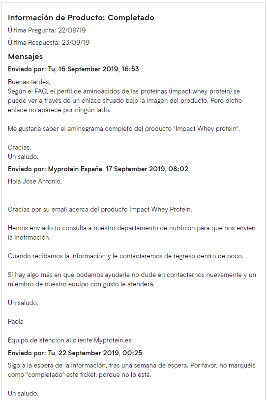 Para mi sorpresa, Myprotein no muestra el aminograma de sus proteínas en ningún sitio; ni en el envase de las proteínas ni en su web.
